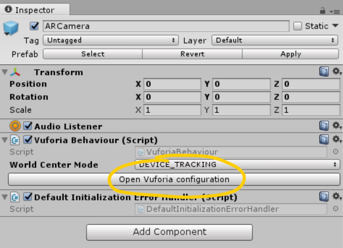 - Select the ARCamera object in the scene and select Open Vuforia Configuration from the inspector window