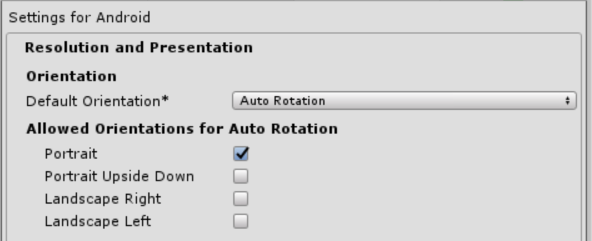 - Under File>Build Settings>Player Settings>Resolution and Presentation, set the Default Orientations to Auto Rotation and Allowed Orientations to Portrait only (not Portrait Upside Down)
