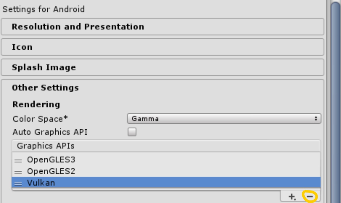 - If you are developing on Android, scroll down and remove Vulkan from the Graphics APIs menu like the image shown below