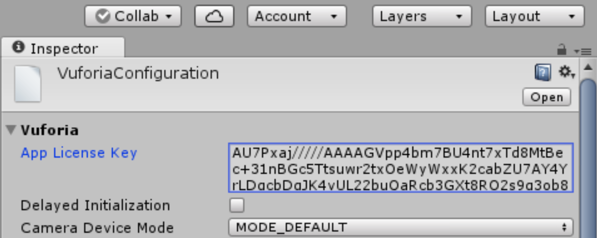 - In the Configuration File that opens, paste your Vuforia License Key into the App License Key text field